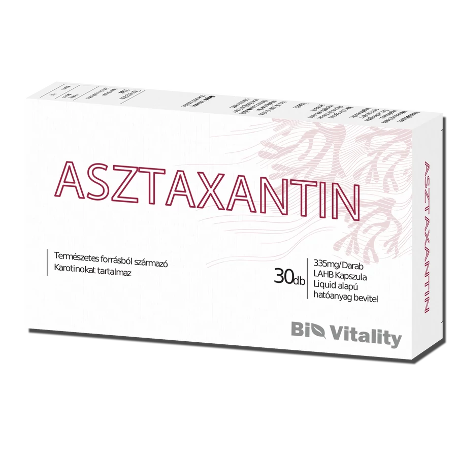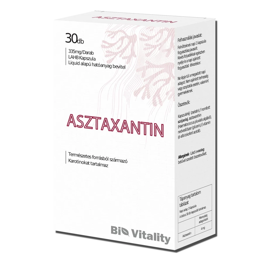 A Bio Vitality Asztaxantin lágy zselé kapszulájában 80mg Haematococcus Pluvialist tartalmaz ami 4 mg asztaxantint szolgáltat.