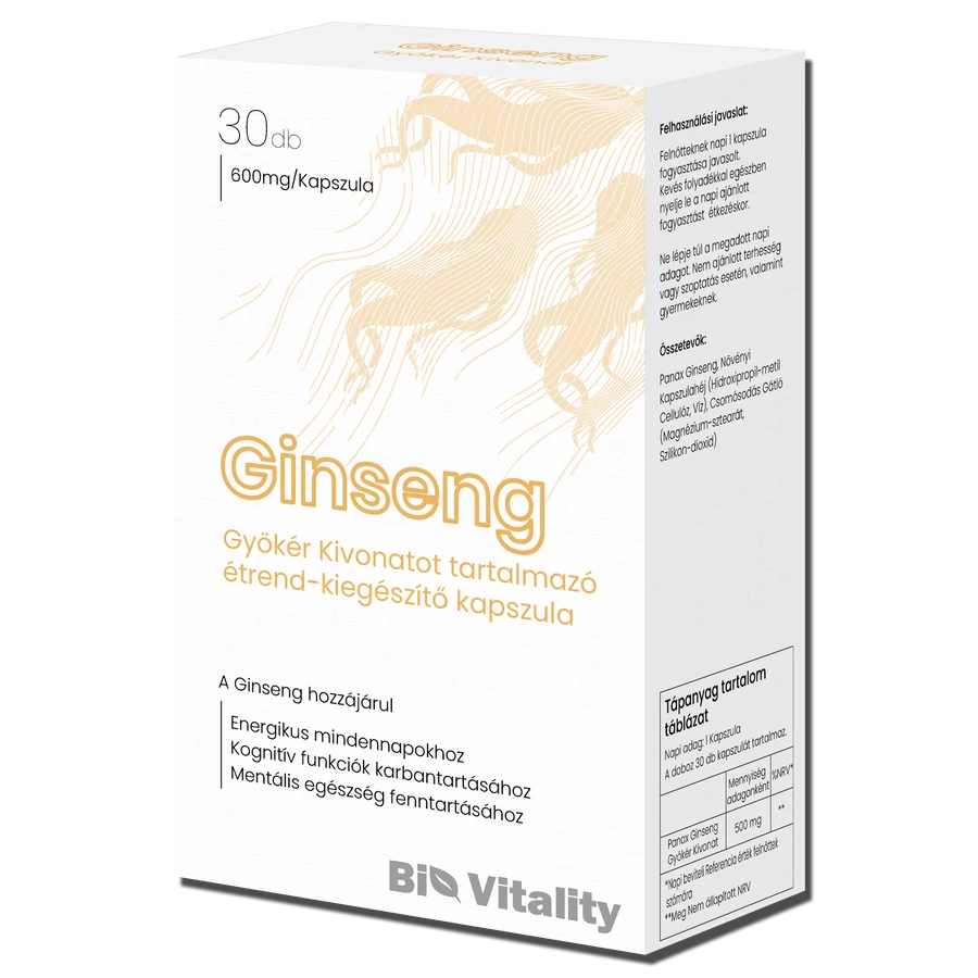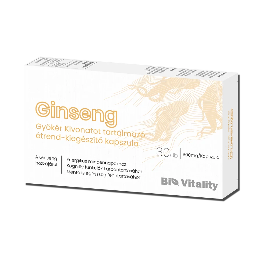A Bio Vitality Ginseng kapszulája 500 mg panax ginseng gyökér kivonatot tartalmaz, a doboz 30 napi adagot foglal magába. A ginsenget Ázsiában és Észak-Amerikában már évszázadok óta használják a gyógyászatban. A valódi ginzeng növény a Panax nemzetséghez tartozik, a szibériai ginzeng és a koreai ginzeng eltérő növények, így a felhasználási funkciójuk is különbözik. A legtöbben az agyműködés serkentésére, a koncentráció növelésére, a szellemi és fizikai állóképesség javítására alkalmazzák. A ginseng segítségével a depresszió, a szorongás és a krónikus fáradtság is természetes módon kezelhető. Mint ismeretes, erősíti az immunrendszert, segíthet legyőzni a fertőzéseket és a merevedési zavarokkal küzdő férfiak is jó hasznát vehetik. Már az amerikai őslakók is a növény gyökerével stimulálták a szervezetet, megszüntetve ezzel a fejfájást, meddőséget, a lázat és az emésztési zavarokat. Manapság rendszeresen, több millió ember élvezi a ginzeng előnyeit.
