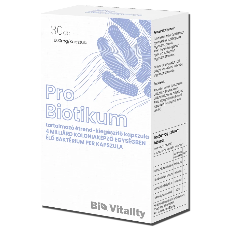A probiotikumok olyan jótékony mikroorganizmusok, amelyek védőhatást biztosítanak bizonyos kártékony kórokozókkal szemben. A probiotikumokról úgy tartják, hogy a bélflóra kiegyensúlyozása által elengedhetetlen szerepet játszanak a megfelelő bélműködés és emésztés fenntartásában. Bélrendszerünk alapvető szerepet vállal a szervezetünket ért "támadások" kivédésében - a bélbaktériumok számos fajtája munkálkodik együtt azért, hogy fenntartsa normál egyensúlyát. Olyan faktorok, mint a stresszes élet, helytelen táplálkozás, infekciók, gyógyszerek vagy antibiotikumos kezelés, felborítja ezt a baktérium egyensúlyt, és elszaporodhatnak a káros baktériumok. Ez az elszaporodás fogékonyabbá teheti a szervezetet olyan étel eredetű fertőzésekre, mint amit a Salmonella, E. coli vagy Listeria is okozhat. Továbbá olyan emésztőrendszeri zavarokhoz is vezethet, mint a gyomorrák vagy a fekélyes colitis. A probiotikumok itt kapnak szerepet abban, hogy megfelelő mennyiségű bevitelük révén helyreállítsák a bélflóra felborult egyensúlyát és támogassák a védekező rendszer megfelelő működését a kórokozókkal szemben. A mi termékünk négy milliárd kolóniaképző egységben élő baktériummal küzd a bélflóra megfelelő egyensúlyáért. A több törzsből álló formula három gondosan kiválasztott és jól kutatott baktériumtörzsekből áll, köztük a lactobacillus acidophilus, a bifidobacterium bifidum és a lactobacillus bulgaricus. A különleges eljárásnak köszönhetően a probiotikomunk ellenáll a gyomorsavnak, így maradéktalanul tudja kifejteni hatását a belekben. Az egészséges bélfóra az egyik legfontosabb alapja az egészséges életnek.