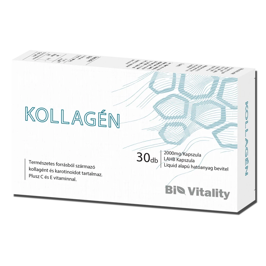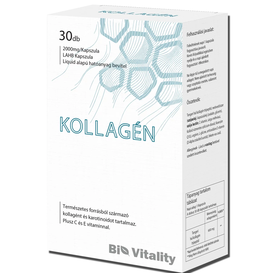 A Bio Vitality Kollagén 600 mg Hal (1-es típusú) kollagént tartalmaz lágyzselé kapszulánként. Plusz E-vitamint és C-vitamint az optimális beépülés és a gyors felszívódás érdekében. Az extra Koenzim Q10 pedig segíthet puhává tenni a feszes bőrt. A hal kollagén sokkal környezetbarátabb választás, mint az egyéb kollagén típusok. A kutatások szerint a hal kollagén antioxidánsokat tartalmaz, melyek csökkenthetik a gyulladásos folyamatokat. A hal kollagén 9 aminosavból 8-at tartalmaz. A marha kollagén a hormonok, a műtrágyák, a fertőzések és a génmódosítások miatt kockázatosabb választás lehet. Mindezek mellett a hal kollagénnek másfélszer jobb a biohasznosulása mint a marha- vagy a sertéskollagénnek. Ez azt jelenti, hogy 1,5 szer kevesebb hal kollagénre van szükség mint marha- vagy sertéskollagénre ugyanahhoz a hatásfokú hasznosuláshoz.